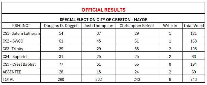 | November 9th, 2025 | Special Election- City of Creston | Official Results |